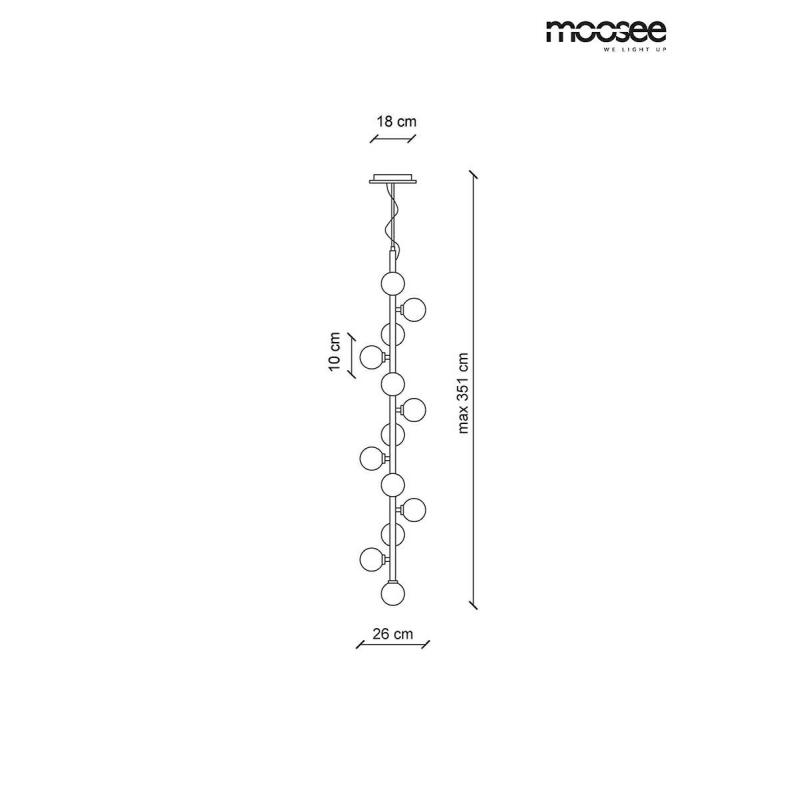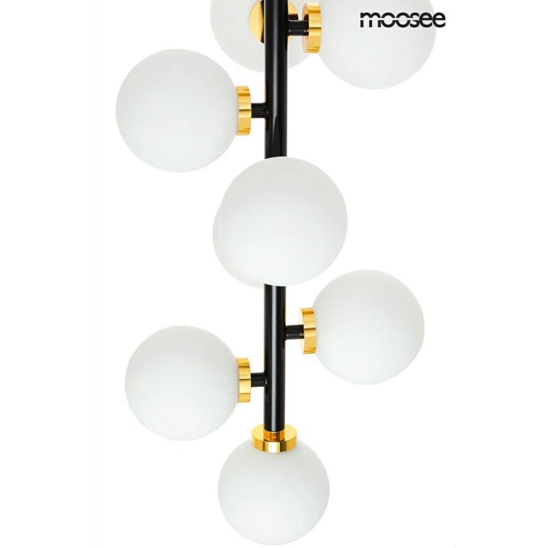Lampa wisząca COSMO VERTICAL M od marki MOOSEE. Lampy z kolekcji Cosmo wykonane zostały z połączenia metalu w czarnym, satynowym kolorze, złotych dekorów i szklanych kulistych kloszy. Trzynaście kloszy wykonanych z mlecznego szkła, umieszczono na pionowym stelażu. Eleganckim elementem są charakterystyczne dla całej kolekcji złote mocowania kloszy. Całość została zawieszona na czarnej podsufitce, przezroczystym przewodzie i stalowej lince. Kolekcję Cosmo cechuje elegancja i doskonałe wykonanie. L