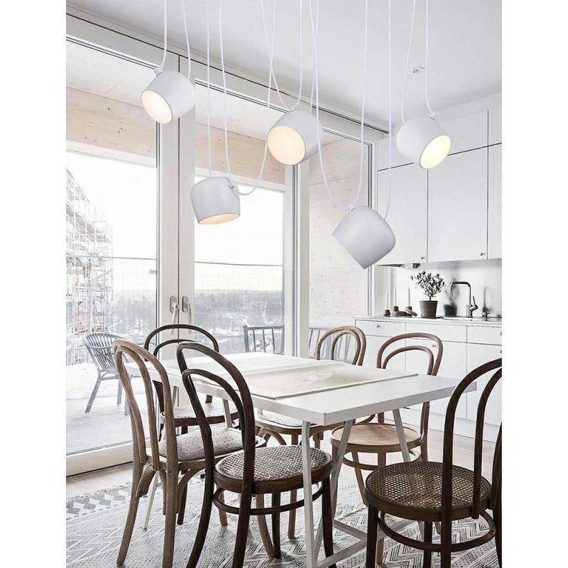 Lampa Eye 5 biała. Propozycja dla zwolenników aranżacji nawiązujących do stylu retro z odrobiną nowoczesności. Lampa składa się z pięciu reflektorów wyposażonych w moduły Ledowe. Jedną z największych zalet jest możliwość rozmieszczenia reflektorów w różnych odległościach od siebie i różnych wysokościach. Lampy z kolekcji Eye cechuje też solidność wykonania – klosz jest z aluminium, co zapewnia mu trwałość na lata. Klosz, przewody, uchwyty oraz podsufitk są w białym kolorze. Całość pasuje do loft