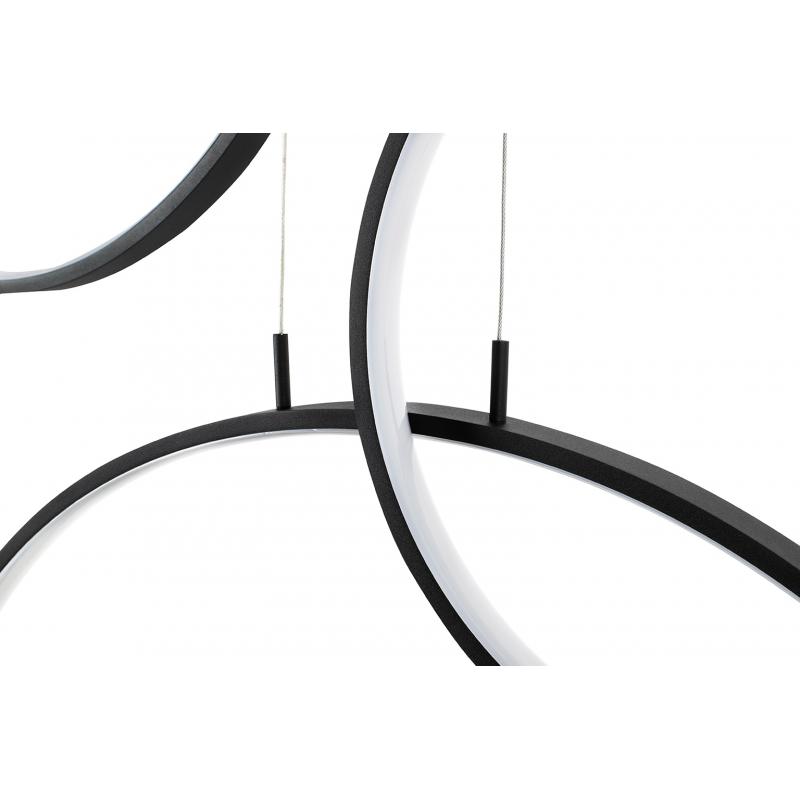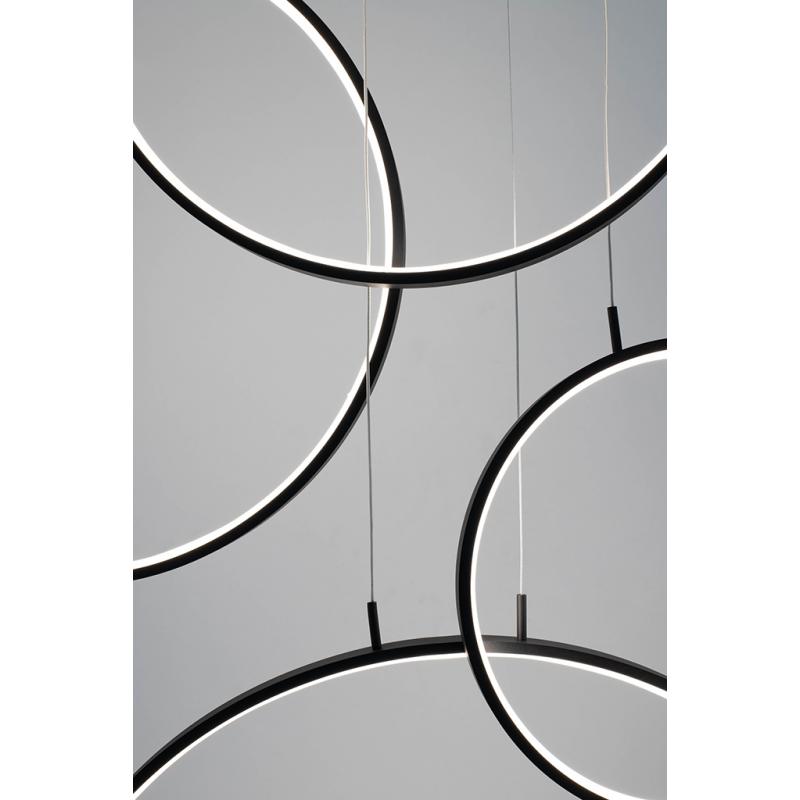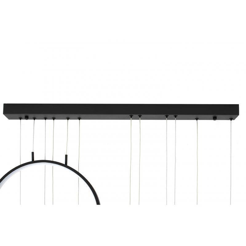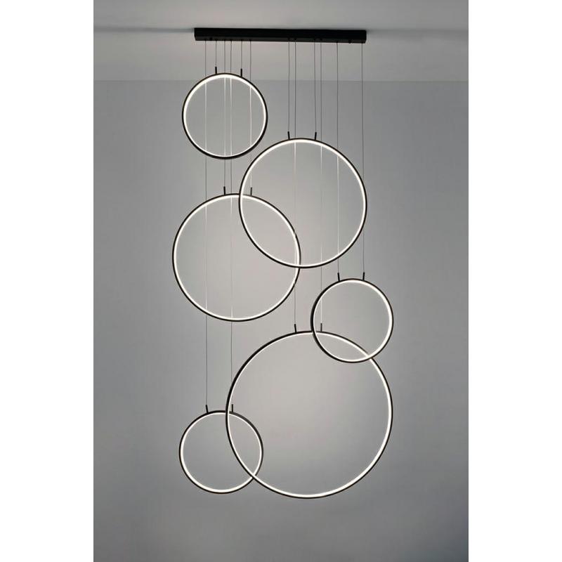 Lampa wisząca CIRCULO SIX. Proste i funkcjonalne oświetlenie składająca się z podsufitki oraz okręgów wykonanych z metalu i aluminium w kolorze czarnym z wbudowanym źródłem światła. Sześć pojedynczych lamp CIRCULO o średnicach 3x 40 cm, 2x 60 cm i 1 x 80 cm kaskadowo zawieszonych na jednej podsufitce. Lampa idealnie wpasuje się w nowoczesne wnętrza, jak i te o klasycznym wystroju.Źródło światła: wbudowany moduł LED 160W Barwa światła: 3000K Strumień świetlny: 12800 lm Wymiar opakowania: 87,5 c