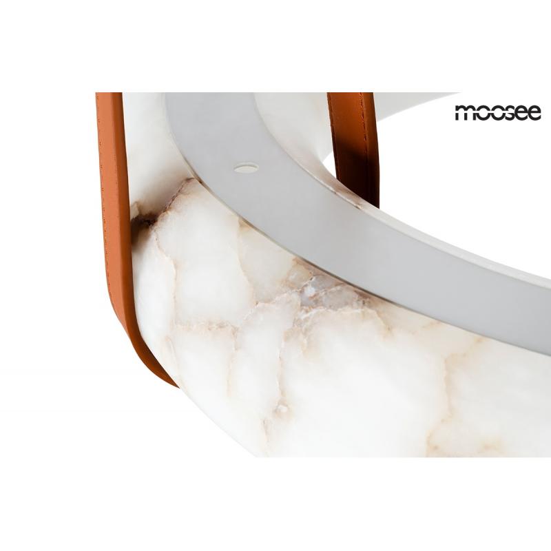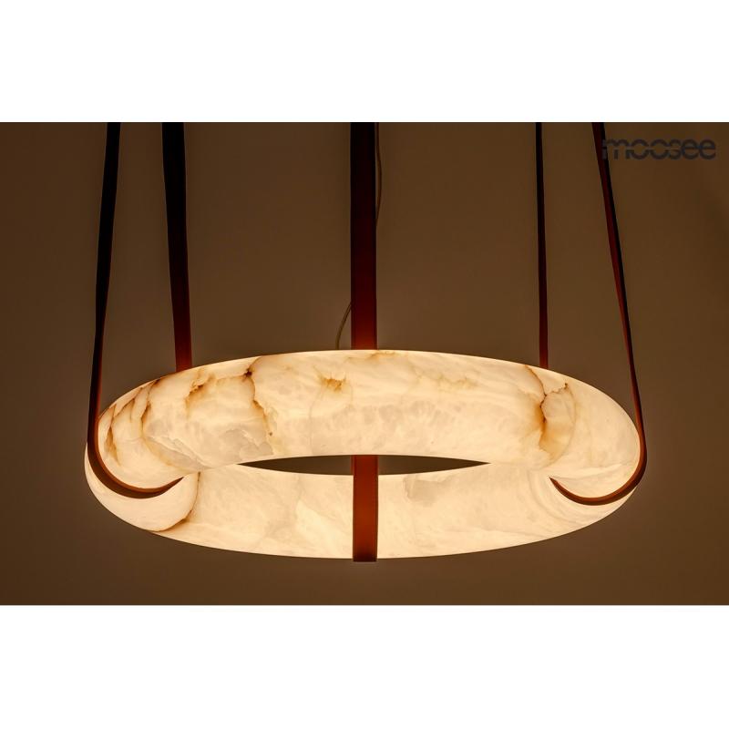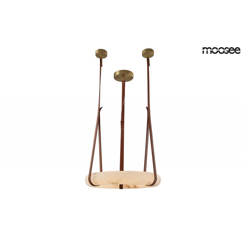 Lampa wisząca GALA od marki MOOSEE. Wykonana została z unikatowego połączenia naturalnego alabastru i mosiądzu w złotym kolorze. Okrągły klosz wykonano z jasnego alabastru. Rozświetlona lampa ukazuje, naturalną strukturę i barwę alabastru. Takie rozwiązanie potęguje wyjątkowe efekty wizualne.Cała kompozycja jest zawieszona na trzech skórzanych pasach, przymocowanych do złotych podsufitek. Gala będzie doskonałym dodatkiem do salonu, kuchni, jadalni oraz hotelowego lobby.Światło: LED 12 W / 960