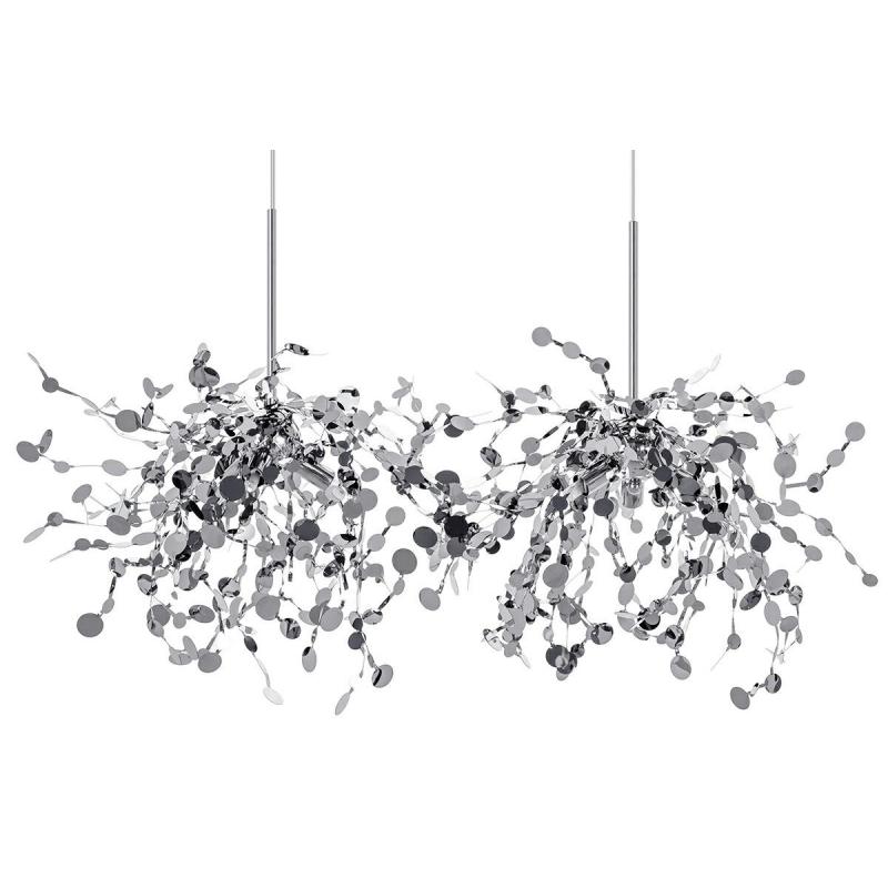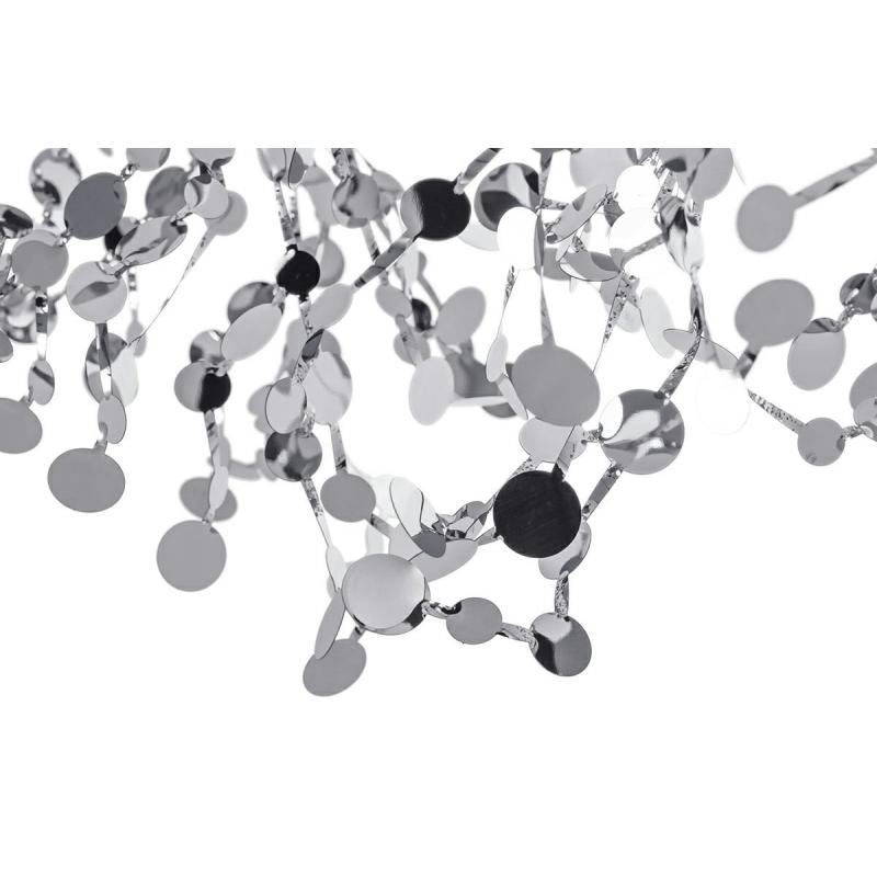 Lampa wisząca Monete chromowana. Wyjątkowo ciekawa lampa która przykuwa uwagę i pobudza kreatywność. Konstrukcja lampy wykonana została z chromowanego metalu. Dwa klosze przypominające wyglądem garści monet podrzuconych do góry. Zostały zawieszone na transparentnym przewodzie i prostokątnej podsufitce. Lampy z kolekcji Monete będą świetnym dodatkiem nad stołem w jadalni lub ekstrawaganckim elementem salonu.Światło: 6 x G9 max 30 W (brak w zestawie) Mocowanie: szer. 44 cm / wys. 55 cm / gł. 3
