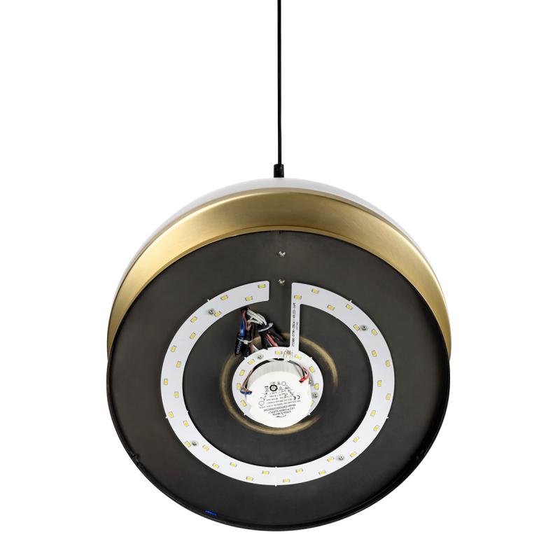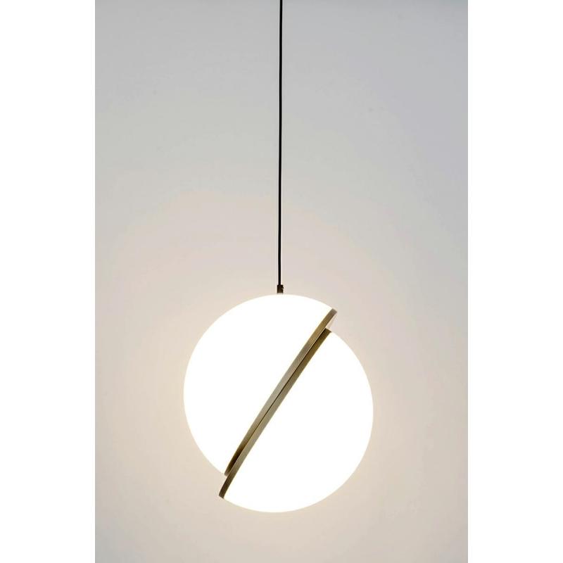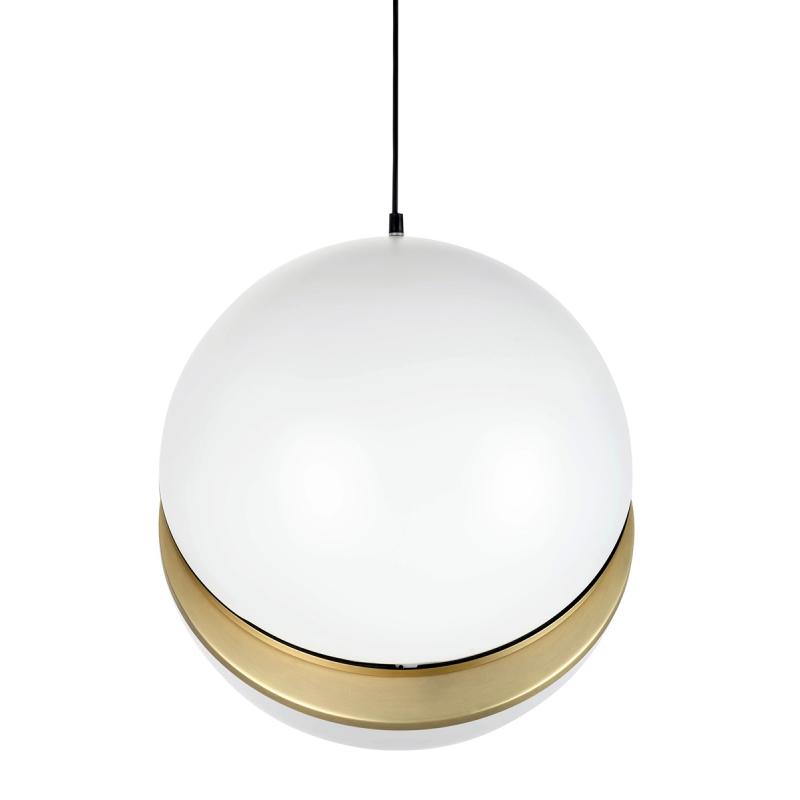 Lampa wisząca GLOBE 38 złota. Wykonana została z połączenia metalu w kolorze antycznego złota i kulistego klosza wykonanego z mlecznego akrylu. Klosz wykonany z dwóch półkul, wykończonych szczotkowanym metalem, skrywa Ledowe źródło światła o ciepłej barwie. Całość została zawieszona na czarnym przewodzie w tekstylnym oplocie. Lampa będzie doskonałym dodatkiem do wnętrz mieszkalnych lub restauracyjno-hotelowych.Światło: LED 8 W / 640 lm / 3000 K Oprawa: wys. 275,5 cm / szer.38 cm Klosz: wys. 43