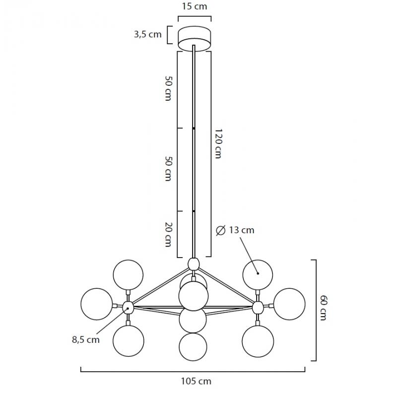MOOSEE lampa wisząca ASTRIFERO 10. Konstrukcja lampy wykonana została z metalu w kolorze złotym. Całość dopełnia 10 okrągłych, szklanych kloszy o bursztynowym kolorze. Do regulacji wysokości oprawy służą 3 metalowe, wkręcane pręty o długościach 2 x 50 cm oraz 1 x 20 cm.Światło: 10 x E27 max 40 W (brak w zestawie) Oprawa: wys. 180 cm / szer. 105 cm / gł. 105 cm Klosza: śr. 13 cm Mocowanie: śr. 15 cm / wys.3,5 cm Montaż: instalacja sufitowa Waga netto: 6 kg Wymiar opakowania: 79 cm / 35 cm / 29