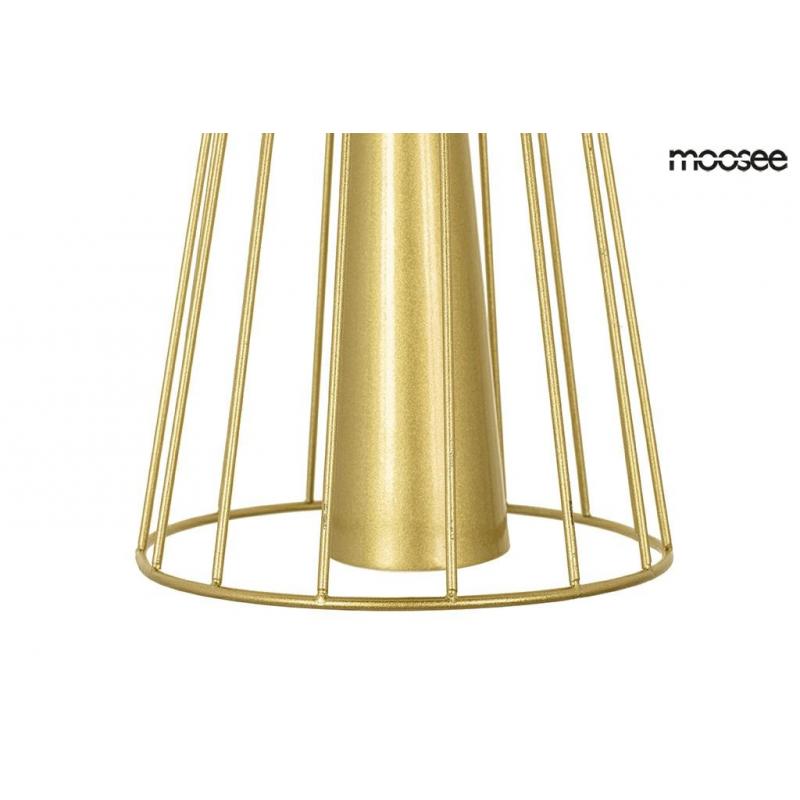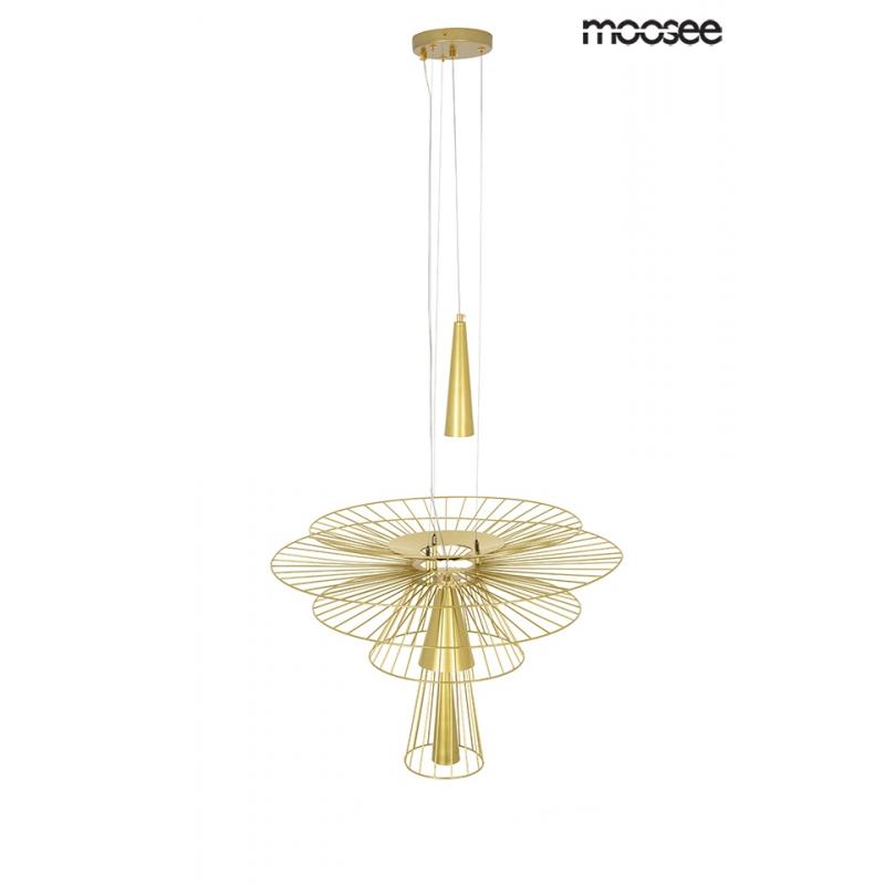 MOOSEE lampa wisząca SESTO złota. Eleganckie i unikatowe wzornictwo idealnie wpisuje się w styl glamour. Kompozycja metalowych drutów ułożona kaskadowo z zastosowaniem dwóch źródeł światła skierowanych w dół. Oświetlenie górnego klosza odbija się od płaskiego okręgu w środku oprawy, który rozprasza strumień światła. Nowoczesny i stylowy wygląd lampy uczyni każde wnętrze wyjątkowym.Światło: 2 x GU10 max. 40 W (brak w zestawie) Oprawa: wys. 250 cm / szer. 60 cm / gł. 60 cm Klosz: wys. 48 cm / sz
