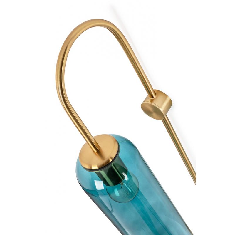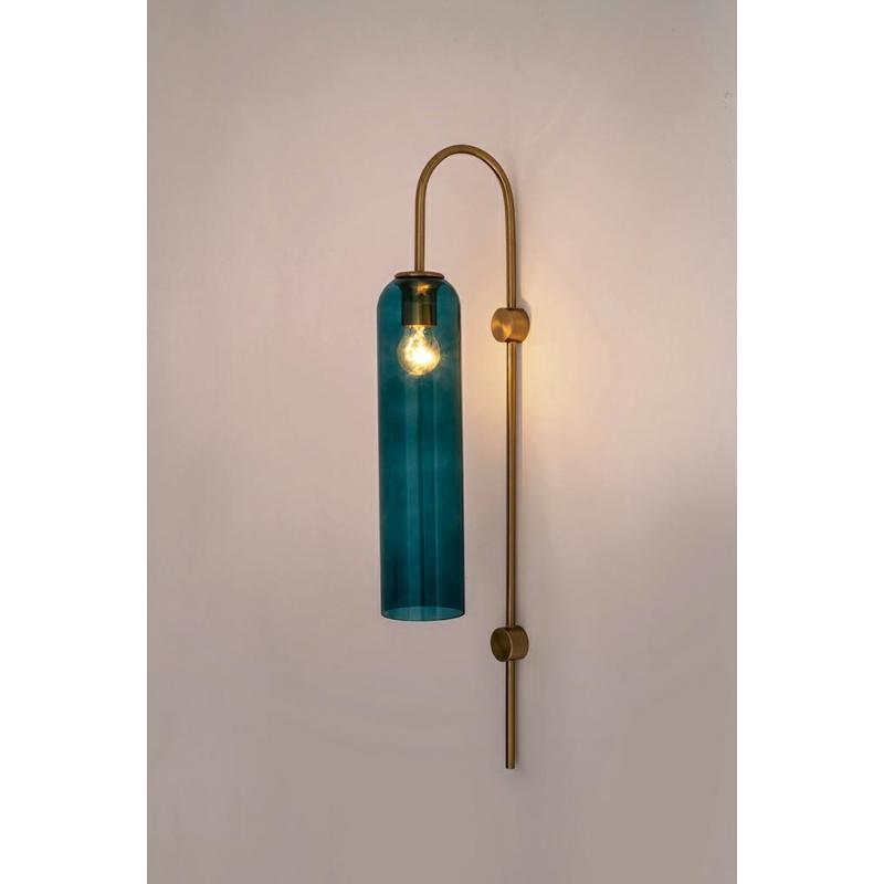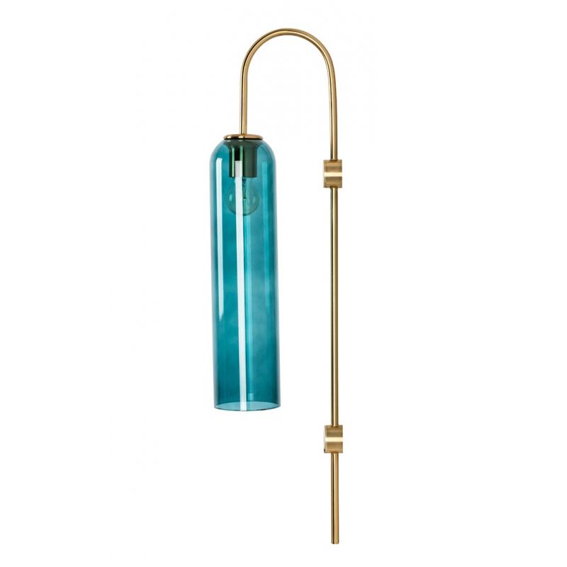 Lampa ścienna Slack z kloszem w kolorze morskim. Konstrukcja została wykonana z metalu w kolorze jasnego złota. Cylindryczny klosz został zrobiony ze szkła w morskim kolorze. Wewnątrz klosza jest umieszczone źródło światła. Kinkiet jest montowany bezpośrednio do instalacji ściennej. Slack będzie przyjemnym akcentem w salonie lub sypialni. Dostępny również w wersji z białym kloszem.Źródło światła: E27 max. 40 W (brak w zestawie) Wysokość klosza: 40 cm Średnica klosza: 10 cm Waga netto 1 szt.: 3