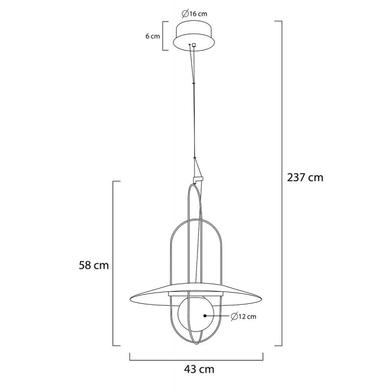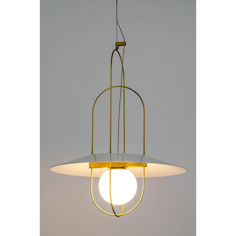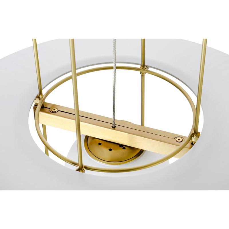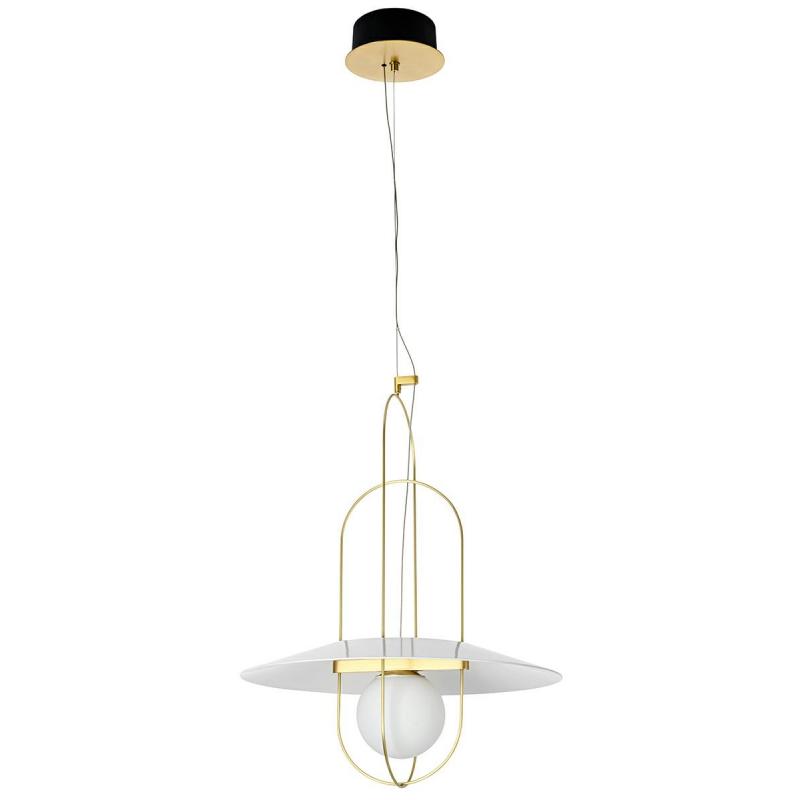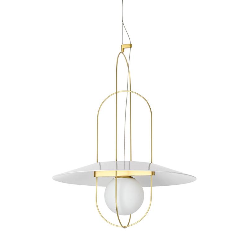 Lampa wisząca Fuente. Wykonana została z połączenia mosiądzu, metalu i okrągłego klosza wykonanego z mlecznego szkła. Klosz umieszczony jest na mosiężnej konstrukcji. Wewnątrz skrywa Ledowe źródło światła o ciepłej barwie. Całość dopełnia metalowa oprawa, która rozprasza światło i jest eleganckim podkreśleniem konstrukcji. Fuenta zawieszona jest transparentnym przewodzie i mosiężnej podsufitce. Lampa będzie doskonałym dodatkiem do wnętrz mieszkalnych lub restauracyjno-hotelowych.Światło: LED