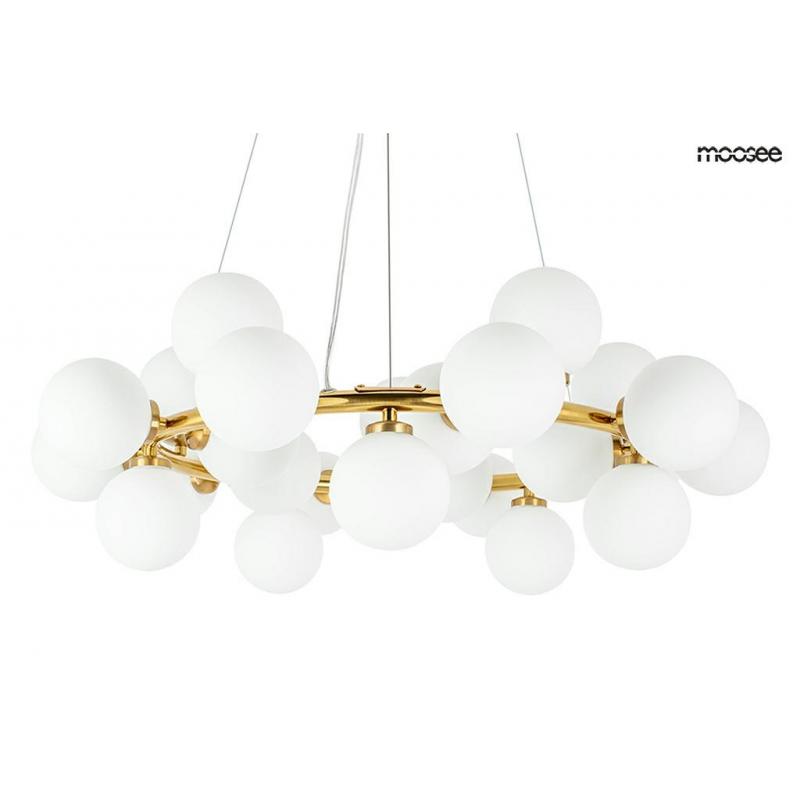 MOOSEE lampa wisząca COSMO 72 złota. Lampa wykonana została z połączenia metalu w złotym kolorze i szklanych, kulistych kloszy. Dwadzieścia pięć kloszy wykonanych z mlecznego szkła, umieszczono na złotym ringu. Całość została zawieszona na przezroczystym przewodzie i stalowych linkach. Lampa z powodzeniem rozświetli wnętrze salonu, kuchni lub hotelowego lobby.Światło: 25 x G4 max. 5 W (brak w zestawie) Oprawa: wys. 216 cm / szer. 72 cm Klosz: wys. 26 cm / szer. 72 cm Klosz - kula: śr. 10 cm