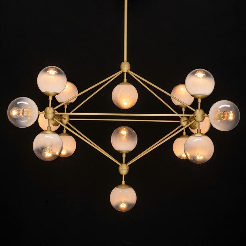 Lampa wisząca Planetario 15. Konstrukcja lampy wykonana została w całości z mosiądzu. Zastosowanie sztywnego zawiesia, składającego się z dwóch elementów, umożliwia zmianę wysokości lampy. Całość dopełnia 15 okrągłych kloszy wykonanych oszronionego szkła. Dzięki temu lampa oferuje ciepłe i przyjemne światło. Planetario doskonale sprawdzi się w salonie i jadalni. Z powodzeniem rozświetli wnętrza domowe oraz restauracyjno-hotelowe. Lampy z kolekcji Planetario dostępne są w wielu rozmiarach i wari