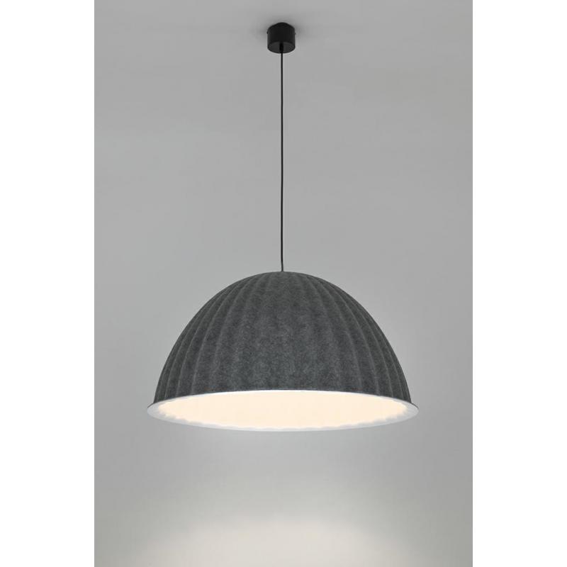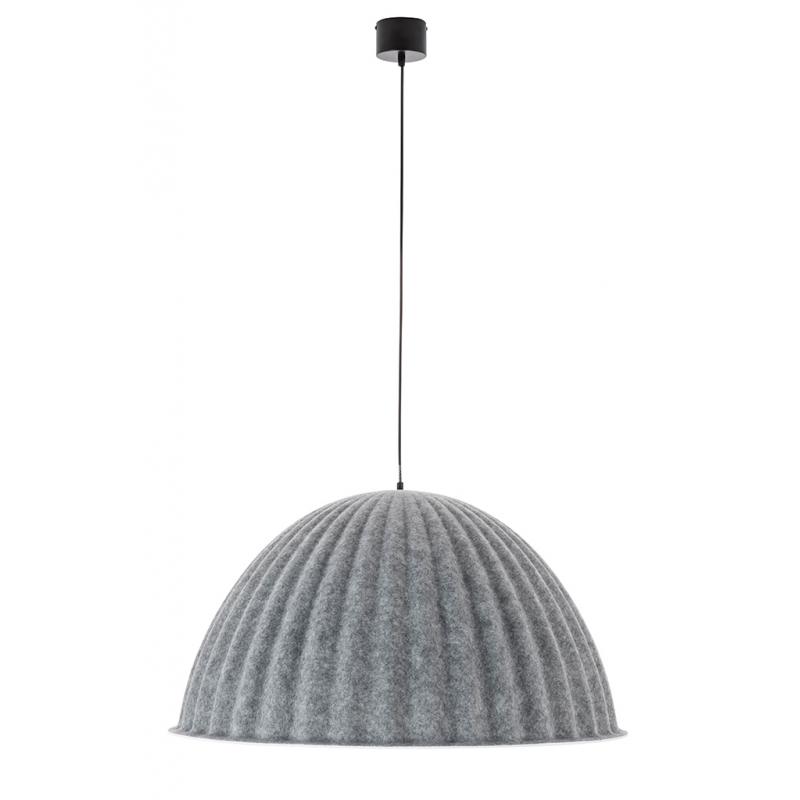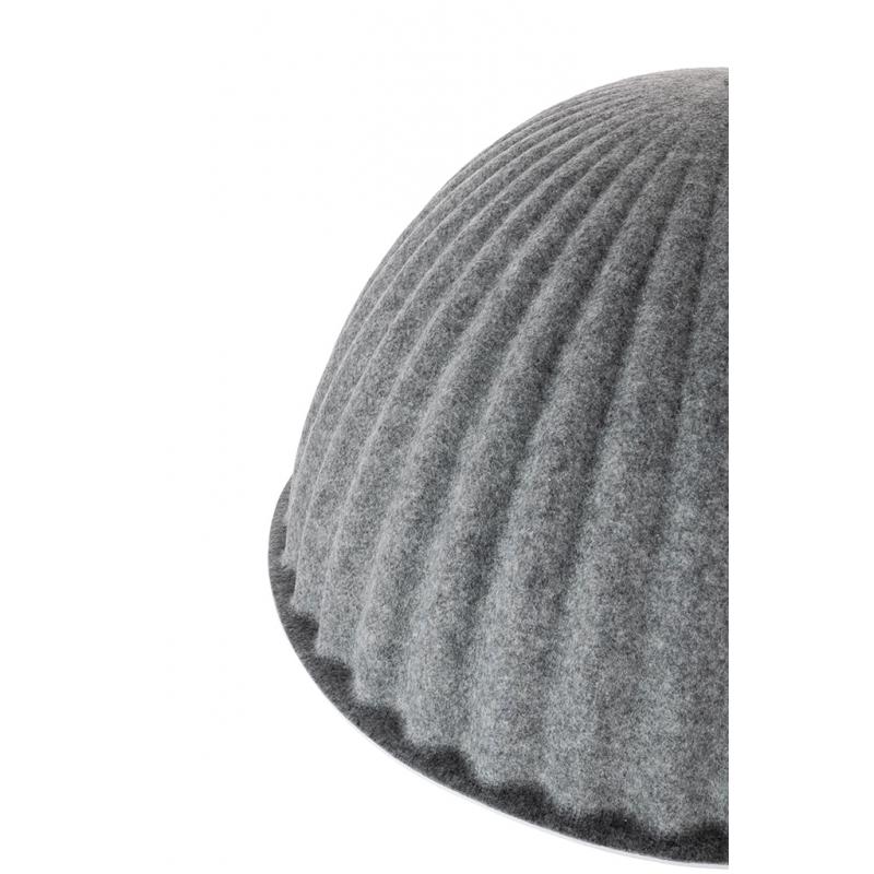 Lampa wisząca MOLD 75. Klosz lampy wykonany z wysokiej jakości filcu obszyty tkaniną w kolorze szarym. Lampa o bardzo ciekawym kształcie przypominającym elegancki kapelusz. Nowoczesny design perfekcyjnie łączy się z praktycznymi właściwościami akustycznymi. Dzięki półokrągłej formie i szerokiej średnicy lampa tłumi dźwięki nadając przyjemny spokój przestrzeni, w której się znajduje.Światło: E27 max. 40 W (brak w zestawie) Klosz: śr. 75 cm / wys. 45 cm Mocowanie: śr. 9 cm / wys. 6 cm Długość