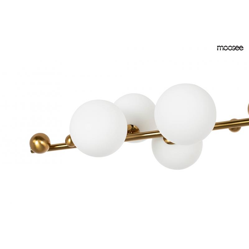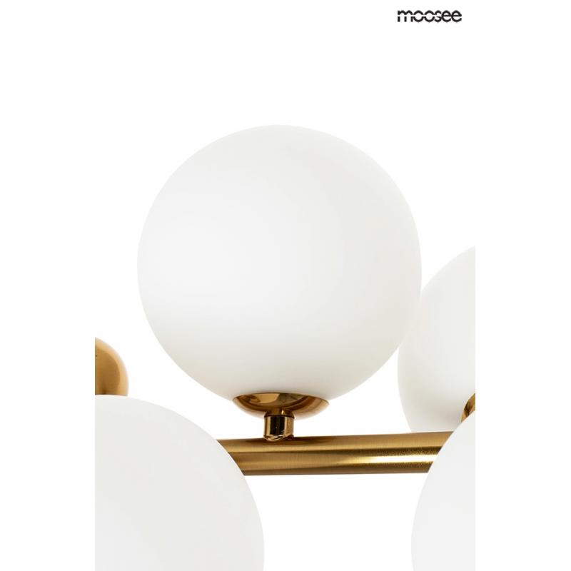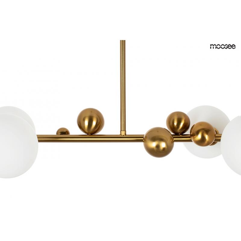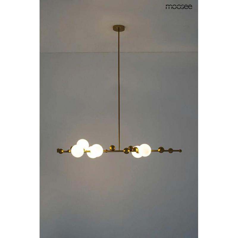 Lampa wisząca VALENTINO LEVEL od marki MOOSEE. Lampy z kolekcji Valentino wykonane zostały z połączenia stali nierdzewnej w złotym, błyszczącym kolorze i szklanych kloszy w kształcie kuli. Sześć kloszy wykonanych z mlecznego szkła, umieszczono na podłużnej konstrukcji. Dodatkowo dodano charakterystyczne dla całej kolekcji elementy dekoracyjne, w postaci złotych kuli. Całość została zawieszona na złotej podsufitce, przezroczystym przewodzie i stalowych linkach. Kolekcję Valentino cechuje eleganc