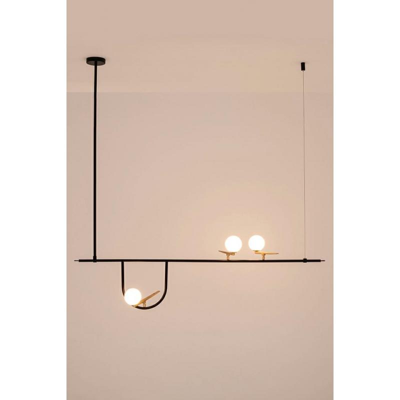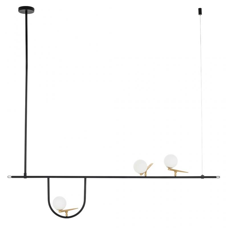 Lampa wisząca TWEETY 160. Konstrukcja lampy wykonana została z metalu w kolorze czarnym. Stelaż przypominający gałąź został udekorowany mlecznymi kloszami osadzonymi na aluminium w kolorze złota. Tweety budzi skojarzenie ptaków odpoczywających na gałęzi. Lampa swoim wyglądem ociepli każde wnętrze. Jest to niezwykła propozycja dla miłośników nowoczesnych i ciekawych aranżacji.Światło: 3 x G9 max. 5 W (brak w zestawie) Oprawa: wys. 270 cm / szer. 156 cm / gł. 28 cm Klosz: śr. 10 cm Mocowanie: śr