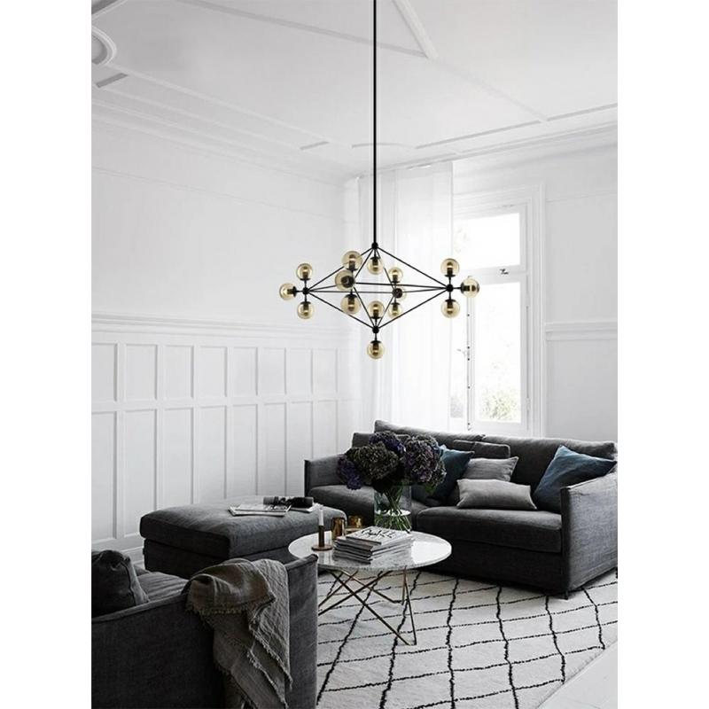 MOOSEE lampa wisząca ASTRIFERO 15. Konstrukcja lampy wykonana została z metalu w kolorze czarnym matowym. Całość dopełnia 15 okrągłych, szklanych kloszy o bursztynowym kolorze. Do regulacji wysokości oprawy służą 3 metalowe, wkręcane pręty o długościach 2 x 50 cm oraz 1 x 20 cm.Światło: 10 x E27 max. 40 W (brak w zestawie) Oprawa: wys. 180 cm / szer. 105 cm / gł. 105 cm Klosz: śr. 13 cm Mocowanie: śr. 15 cm / wys. 3,5 cm Ramiona:: 3 x wys. 57 cm / 3 x 39,5 cm / 1 x 6 cm Pałąk od podsufitki: wy