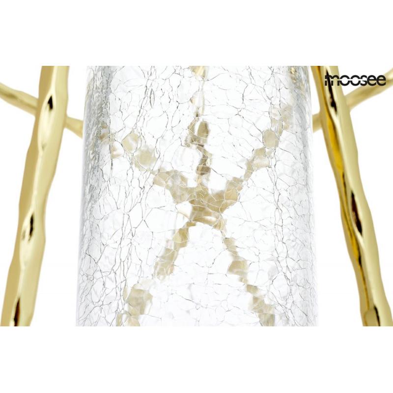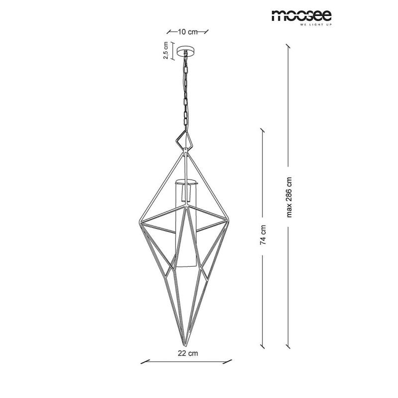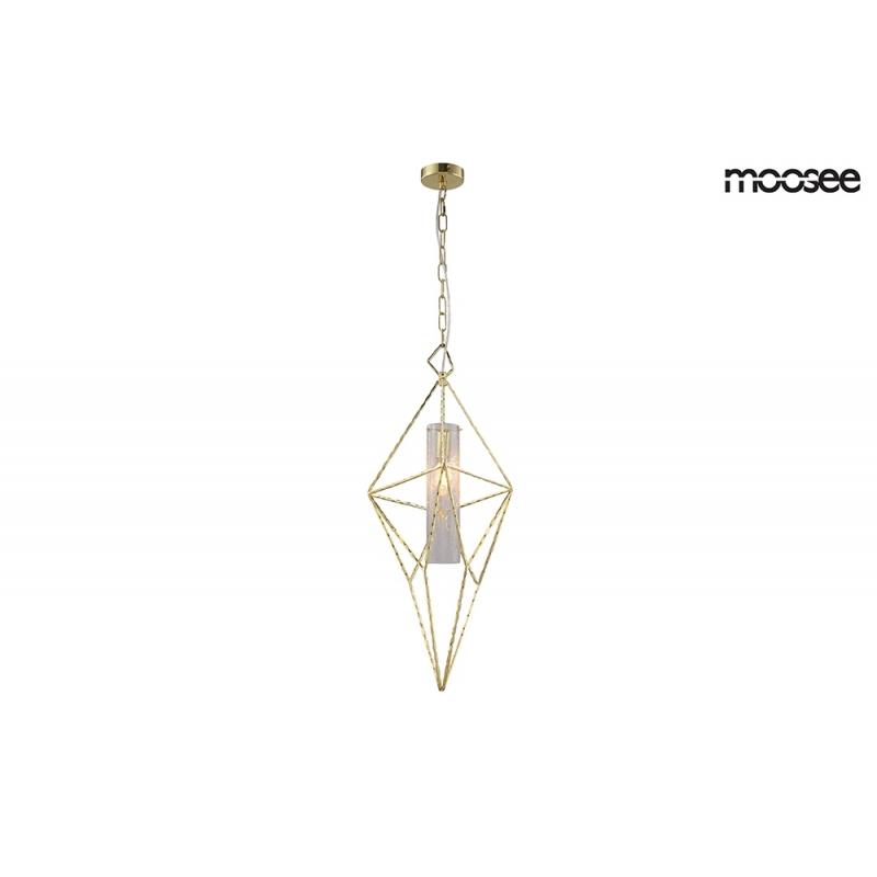 Lampa wisząca HAVANA L od marki MOOSEE. Geometryczną konstrukcję wykonano z połączenia metalu w kolorze złotym i szklanego klosza. Klosz otoczony jest geometrycznym stelażem. Całość została umieszczona na złotej podsufitce, eleganckim łańcuszku i transparentnym przewodzie. Lampy z kolekcji Havana tworzą elegancką kompozycję, która z powodzeniem rozświetli wnętrze salonu, kuchni lub hotelowego lobby.Światło: E14 max. 40 W (brak w zestawie) Oprawa: wys. 286 cm / szer. 22 cm Klosz: wys. 74 cm /
