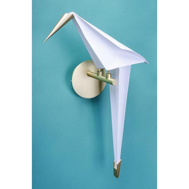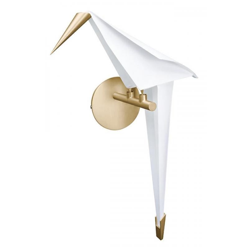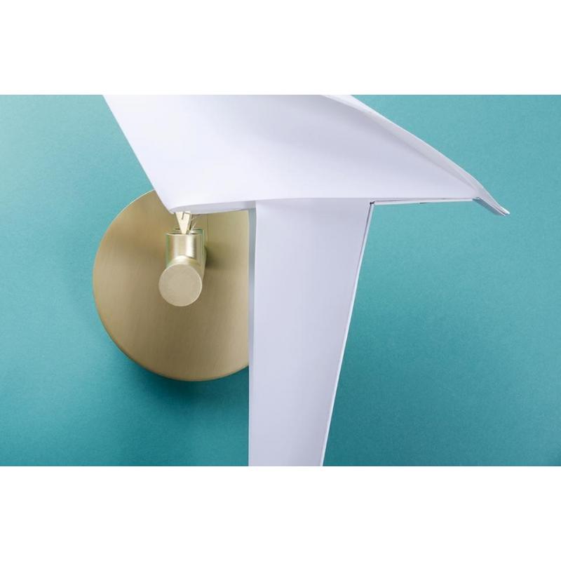 Lampa ścienna LORO WALL RIGHT złota. Konstrukcja lampy wykonana została z metalu w złotym, satynowym kolorze. Klosz w kształcie ptaka, wykonany jest z polipropylenu w białym kolorze. Wewnątrz klosza zamontowany jest moduł ledowy.Źródło światła: LED 1 x 8 W Barwa światła: 3000 K Strumień świetlny: 640 lm Waga netto 1 szt.: 1 kg Sposób wysyłki: Paczka Wymiary paczki: 35 cm x 58 cm x 20 cm.