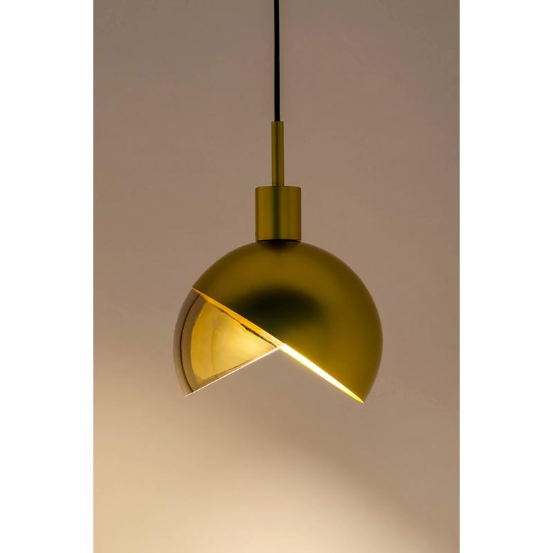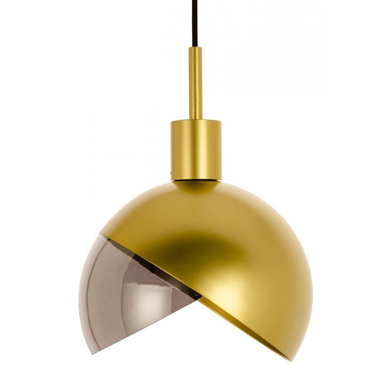 Lampa wisząca Globo 25 w kolorze złotym Klosz lampy to połączenie dwóch półkul. Jedna wykonana została z metalu w kolorze złotym z matowym odcieniem. Druga, natomiast to szkło dymione (przyciemnione) które od zewnętrznej strony pokryte jest chromowaną poświatą. Dopełnieniem jest czarny przewód w oplocie, połączony ze złotą podsufitką. Całość tworzy wyjątkowo elegancką kompozycję. Lampa doskonale sprawdzi się w salonie, jadalni, będzie miłym dodatkiem do sypialni.Światło: E27 max. 40 W (brak w