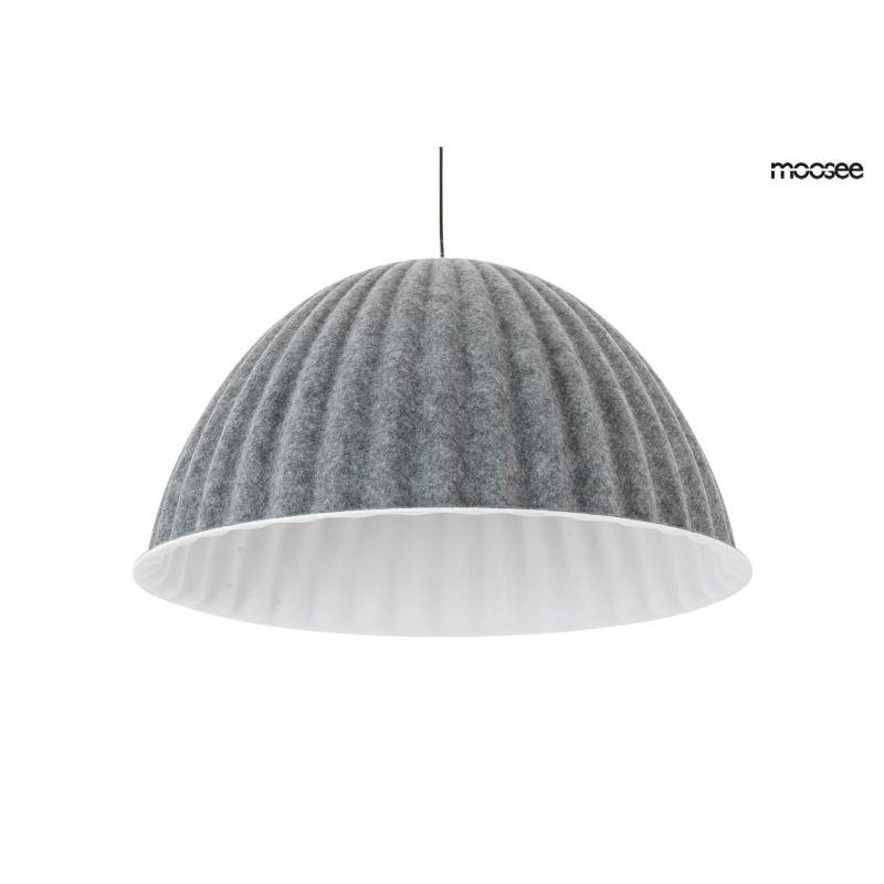 MOOSEE lampa wisząca MOLD 55 szara. Klosz lampy wykonany z wysokiej jakości filcu obszyty tkaniną w kolorze szarym. Lampa o bardzo ciekawym kształcie przypominającym elegancki kapelusz. Nowoczesny design perfekcyjnie łączy się z praktycznymi właściwościami akustycznymi. Dzięki półokrągłej formie i szerokiej średnicy lampa tłumi dźwięki, nadając przyjemny spokój przestrzeni, w której się znajduje.Światło: E27 max. 40 W (brak w zestawie) Klosz: śr. 55 cm / wys. 30 cm Mocowanie: śr. 9 cm / wys. 6