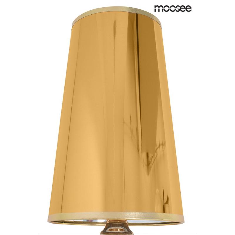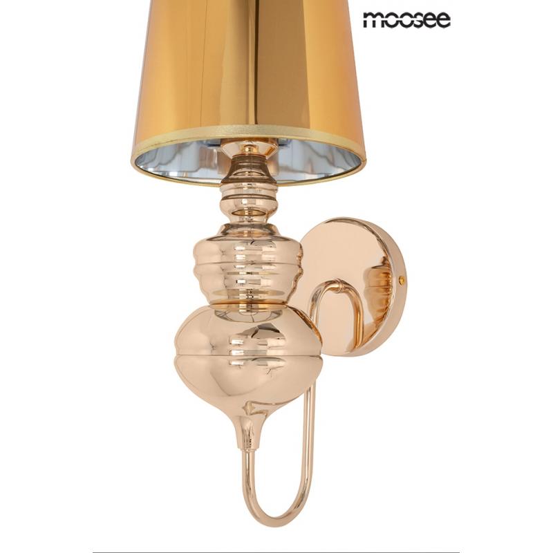 MOOSEE lampa ścienna QUEEN 20 złota. Nowoczesna, a zarazem minimalistyczna propozycja oświetlenia. Gładki abażur został wykonany z tworzywa sztucznego, a stelaż lampy uformowano z aluminium w lustrzanym połysku. Prostota designu powoduje, że sprawdzi się ona zwłaszcza w aranżacjach w stylu klasycznym oraz glamour.Światło: E27 max. 60 W (brak w zestawie) Oprawa: wys. 58,5 cm / szer. 18 cm / gł. 25 cm Klosz: wys. 28 cm / szer. 18 cm / gł. 18 cm Klosz - dolny element: wys. 33,5 cm / szer. 13 cm /