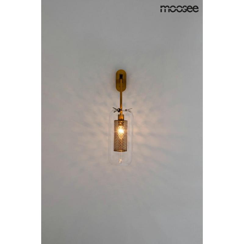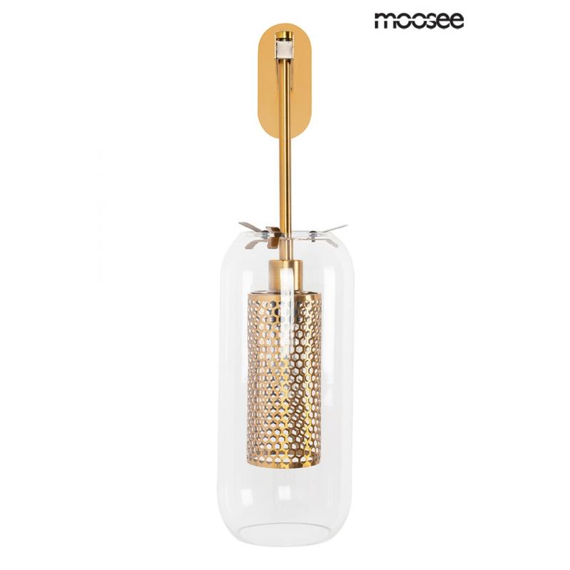 MOOSEE lampa ścienna LAMPION złota. Kinkiet wyglądem przypomina elegancki lampion, który został wykonany z połączenia stali w kolorze złotym oraz transparentnego szklanego klosza. Ażurowe wykończenie wnętrza oprawy w ciekawy sposób rozprasza ciepłe światło, tworząc wspaniały efekt.Światło: E14 max 60 W (brak w zestawie) Oprawa: wys. 57 cm / szer. 12 cm / gł. 30 cm Klosz: śr. 12 cm / wys. 29 cm Klosz wewnętrzny: śr. 7 cm / wys. 17 cm Mocowanie: szer. 6 cm / gł. 3 cm / wys. 13 cm Element mocują