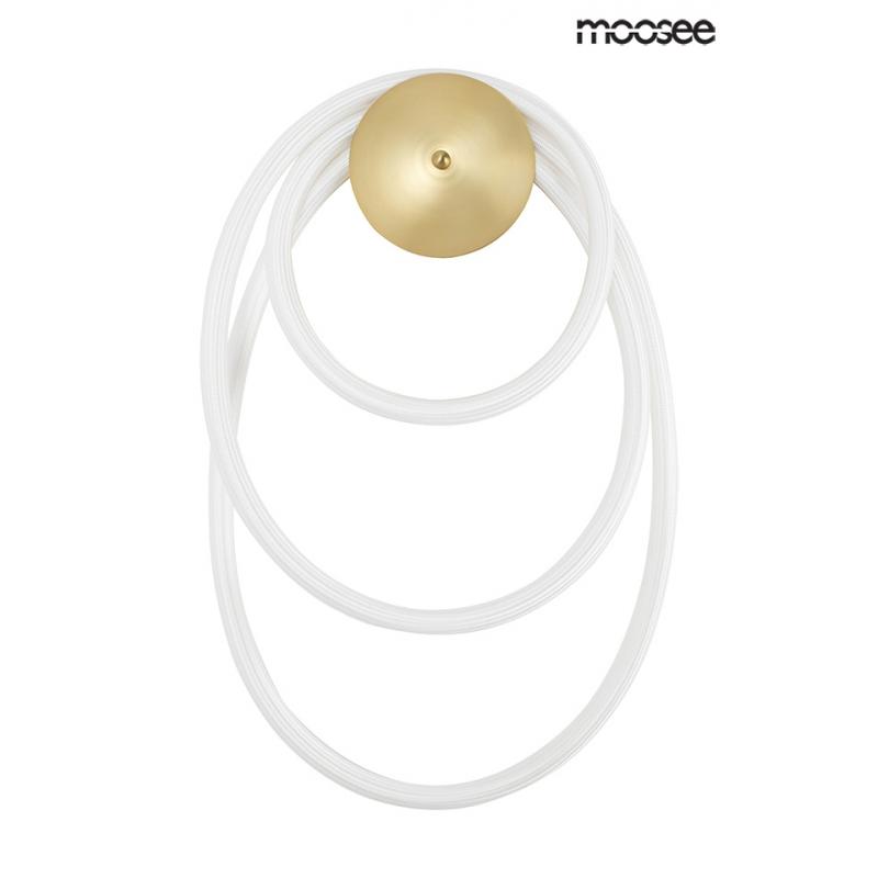 MOOSEE lampa ścienna SERPIENTE złota. Metalowa montatura w kolorze złotym przepleciona elastycznym wężem w oplocie z tkaniny, który skrywa ledowe źródło światła. Zestawienie kolorystyczne złota z bielą świetnie odnajdzie się w subtelnych, eleganckich aranżacjach. Z kolekcji Serpiente dostępne są również lampy wiszące, dzięki czemu można stworzyć spójne aranżacje.Światło: LED 34 W / 2720 lm / 3000 K Oprawa: wys. 166 cm / szer. 38 cm / gł. 13 cm Klosz: wys. 64 cm / szer. 38 cm / gł. 13 cm Wąż LE