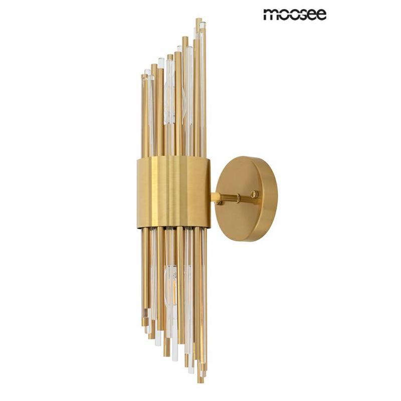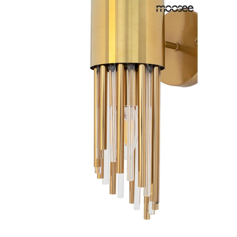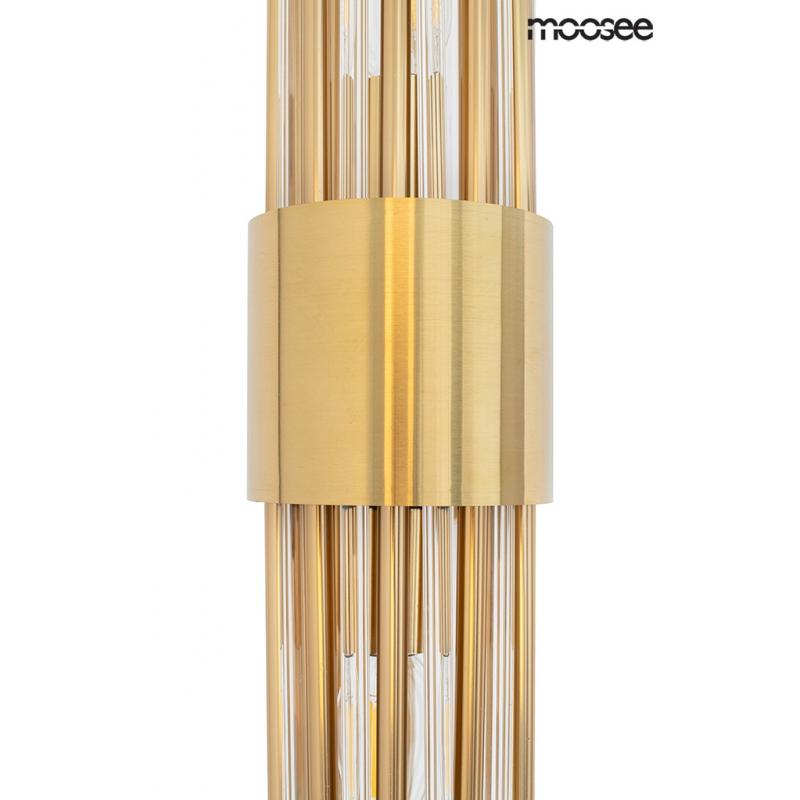 MOOSEE lampa ścienna AMADEO złota. Niezwykle nowoczesny i elegancki kinkiet w stylu glamour. Kryształowe klosze o różnych długościach, przeplatają się z dekoracyjnymi złotymi elementami w kolorze złotym, optycznie wydłużając kinkiet. Całość zamontowana na metalowym stelażu w kolorze złotym, a snop światła skierowany jest zarówno w górę, jak i w dół.Światło: 2 x E14 max 40 W (brak w zestawie) Oprawa: wys. 50 cm / szer. 12 cm / gł. 18,5 cm Mocowanie: śr. 12 cm / gł. 2,5 cm Element ozdobny: wys.