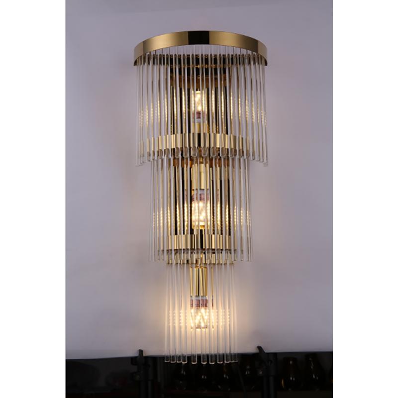 MOOSEE lampa ścienna ESTRO złota. Nowoczesna oprawa w stylu glamour została wykonana z połączenia szkła oraz stali nierdzewnej w złotym kolorze. Oświetlenie w wyjątkowy sposób przebija się przez kaskadowo zawieszone transparentne klosze. Dzięki zastosowaniu uniwersalnego gwintu E14 moc oraz barwę światła możemy dostosować do własnych potrzeb.Światło: 3 x E14 max. 40 W (brak w zestawie) Oprawa: wys. 58 cm / szer. 28 cm Montaż: instalacja ścienna Waga netto: 1,5 kg Wymiar opakowania: 60 cm / 30