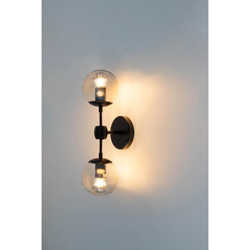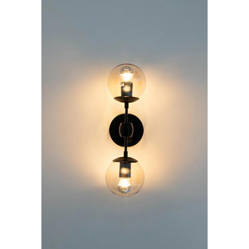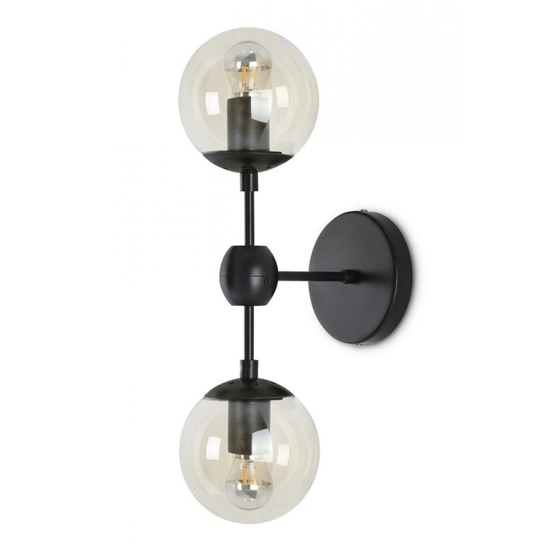 Lampa ścienna PLANETARIO 2 czarna. Konstrukcja wykonana została z metalu w kolorze czarnym matowym. Całość dopełniają 2 okrągłe klosze wykonane z transparentnego szkła z poświatą bursztynową. Dzięki temu światło jest ciepłe i przyjemne. Kinkiet doskonale sprawdzi się w salonie, jadalni lub sypialni.Źródło światła: 2 x E27 max 40W (brak w zestawie) Grubość podsufitki 2 cm Średnica podsufitki: 12 cm Średnica klosza: 12 cm Długość pręta pionowego: 18 cm Waga netto: 1,5 kg Wymiary opakowania: 40 c
