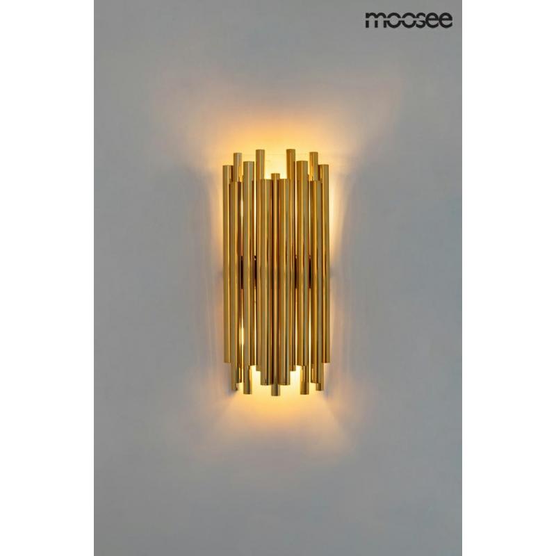 Lampa ścienna TUBO złota. Kinkiet wykonany w całości ze stali nierdzewnej w kolorze złotym. Klosz z nieregularnie ułożonych elementów sprawia, że strumień światła zostaje rozproszony w przyjemny i ciekawy sposób.Światło: 2 x E14 max 40 W (brak w zestawie) Oprawa: wys. 40,5 cm / szer. 17,5 cm / gł. 9,5 cm Mocowanie: wys. 7 cm / szer. 17 cm / gł. 8,5 cm Montaż: instalacja ścienna Waga netto: 2,1 kg Wymiar opakowania: wys. 48 cm / szer. 27 cm / gł. 16 cm.