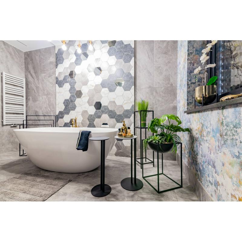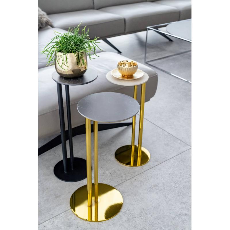 Blaty stolików wykonane są ze spieku kwarcowego i szkła.