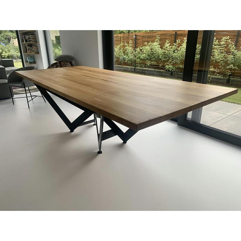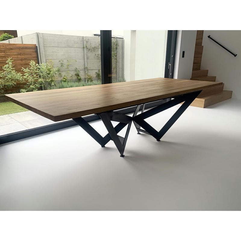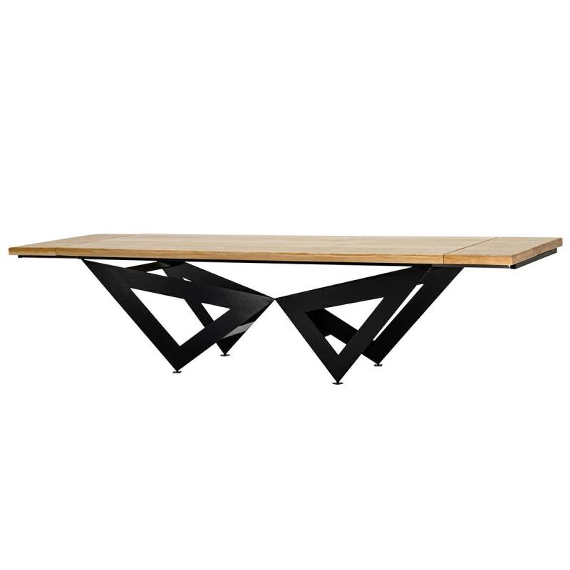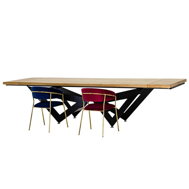 Stół rozkładany Axel 260-340 cm Starannie wykonany Blat z naturalnego drewna dębowego o grubości 5 cm. Dodatkowo został zabezpieczony lakierem matowym. Geometryczna podstawa zapewniająca stabilność i podkreślająca charakter stołu, została zrobiona z metalu w kolorze czarnym, matowym. Dzięki dodatkowym elementom stół może mieć trzy długości, 260 cm > 300 > 340 cm. Zapewniając wygodę i swobodę przy licznych okazjach. Axel doskonale sprawdzi się w jadalni oraz salonie, godnie pełniąc funkcj