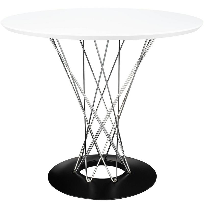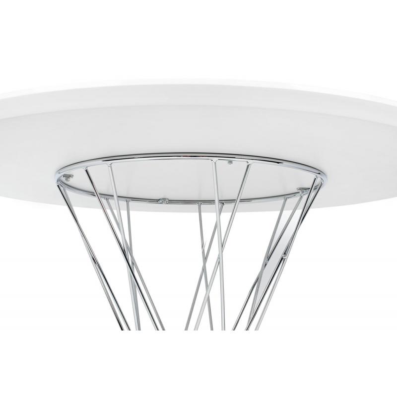 Stół Twist 100. Blat wykonany z MDF-u w kolorze białym. Chromowane pręty łączące blat z metalową podstawą w kolorze czarnym błyszczącym. Stół doskonale sprawdzi się we wnętrzach nowoczesnych.Średnica blatu: 100 cm Waga netto 1 szt.: 12 kg Waga opakowania: 17 kg Maksymalna ilość szt. w opakowaniu: 1 Sposób wysyłki: Paleta Wymiary opakowania: 108 cm x 108 cm x 8 cm i 53 cm x 53 cm x 53 cm Produkt do samodzielnego montażu: Tak