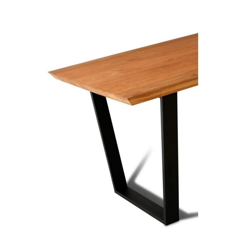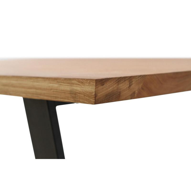 Blat stołu wykony jest z litego dębu, prezentującego piękne usłojenie drewna, jego ciepłą kolorystykę i widoczne sęczyny z pęknięciami.